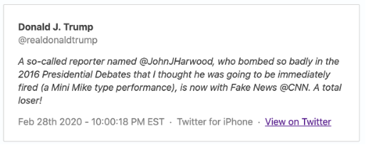 Certainly, former President Trump’s popularity cannot be directly attributed to his use of name-calling. There are so many other reasons why people have and continue to support him. But it nevertheless seems to be a primary communications strategy, therefore warranting some investigation. In fact, in a review of one hundred tweets from former President Trump starting from the day that I first sat down to consider his name-calling (February 28, 2020), I counted about fifteen ad hominem attacks on others. Of course, the exact number depends on whether you count tweets appearing on his timeline (retweets) or his personal tweets only. It also depends on whether you count disparaging remarks directed at a group, such as “Democratic Clown Show” (February 29) and exclude or include his indirect disparaging remarks, such as “the real politicians ate them [Tom Steyer and Mike Bloomberg] up and spit them out” (February 29). I did not count these. I only counted the obvious examples, such as when the President called CNN reporter John Harwood “a total loser!” (February 28).[i]
