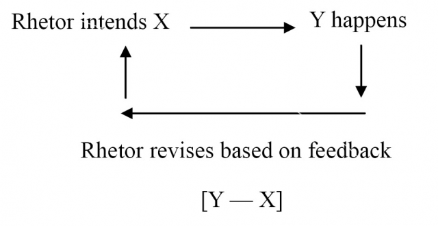 First-order systems theory excludes (and is thus indebted to) Newtonianisms’s autonomous and deterministic agent, replacing it with the less predictable “we” of interdependent action. Broadly speaking, first-order systems theory (sometimes called “early cybernetics” and typically associated with mathematical modeling and information processing) focuses on developing efficient actions for purposes of restoring equilibrium and stability. A system with no single controlling agent is guided by a feedback loop, through which actual output is measured against desired output, and changes are made to correct for any discrepancy between them (see Clarke and Hansen 2-6). First-order systems theory thus answers the question, “How do things happen?” by asserting, “We make things happen.” On this view, agency is distributed among participating elements, and causality is circular: when, for example, a rhetor’s intention misses the mark, he revises future attempts to communicate based on his audience’s feedback (see fig 1).