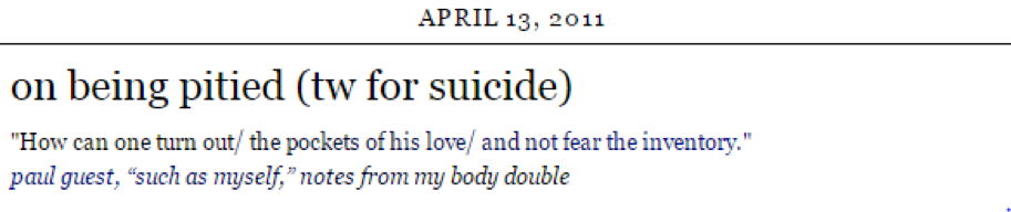 In my years of personal writing in digital spaces, I have found that trigger warnings often serve as inventive devices, inviting authors to compose more expressive, visceral writing. Trigger warnings frequently function as the “starting point” of a post where writers position themselves in relation to their audiences. Writers with mental disabilities often use trigger warnings to write complexly about their mental state—even suicidality. In some cases, these warnings work in personal narratives to focus the power of pain; trigger warnings in the most personal of writing spaces sometimes replace the titles of posts where writers narrate their everyday experiences with mental disability. For example, in a post I wrote in 2013 describing how graduate school was both driving me mad and giving me life, the title of my blog entry is simply a trigger warning.